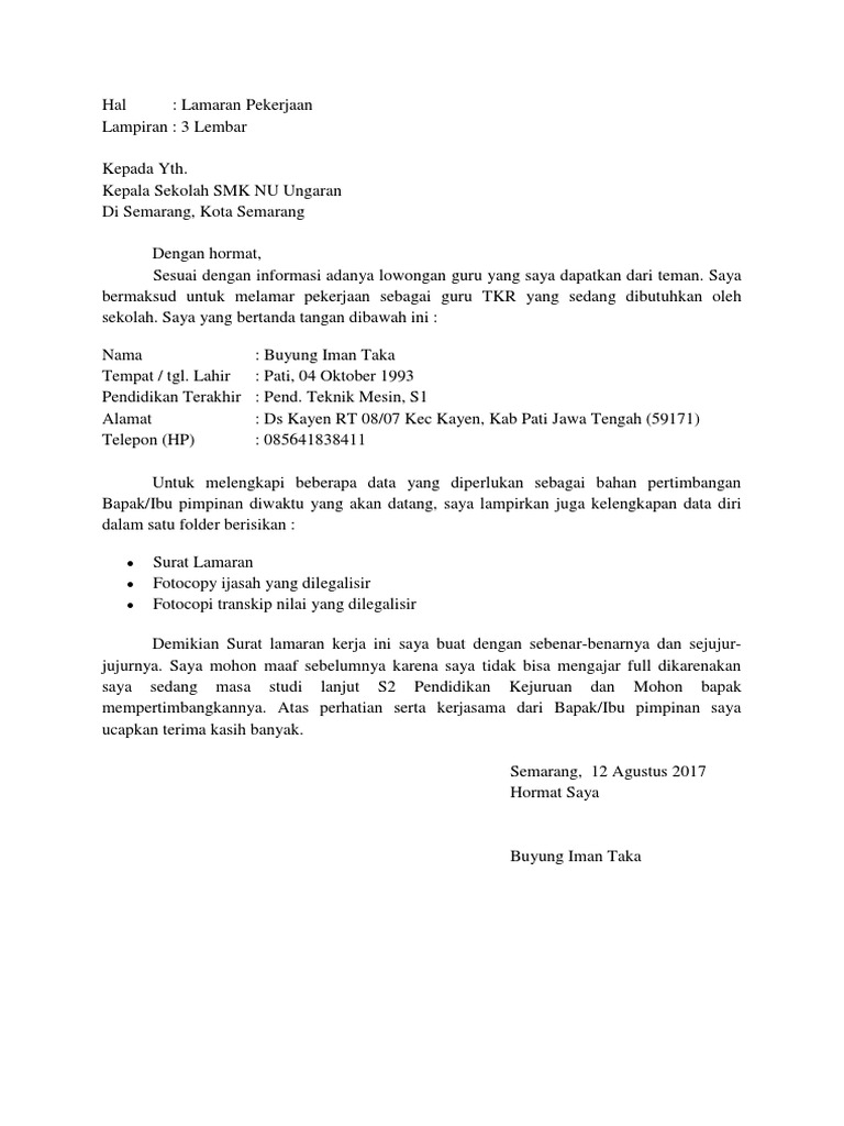 Ada banyak contoh surat lamaran kerja yang bisa kamu jadikan acuan sebelum melamar pekerjaan. Pilih contoh surat lamaran kerja yang singkat padat dan jelas. Hormat saya, _____ download contoh surat lamaran kerja pabrik versi word di sini. Check spelling or type a new query. Hampir semua kegiatan diubah menjadi ke arah digitalisasi, tidak terkecuali dengan kegiatan pencarian kerja.